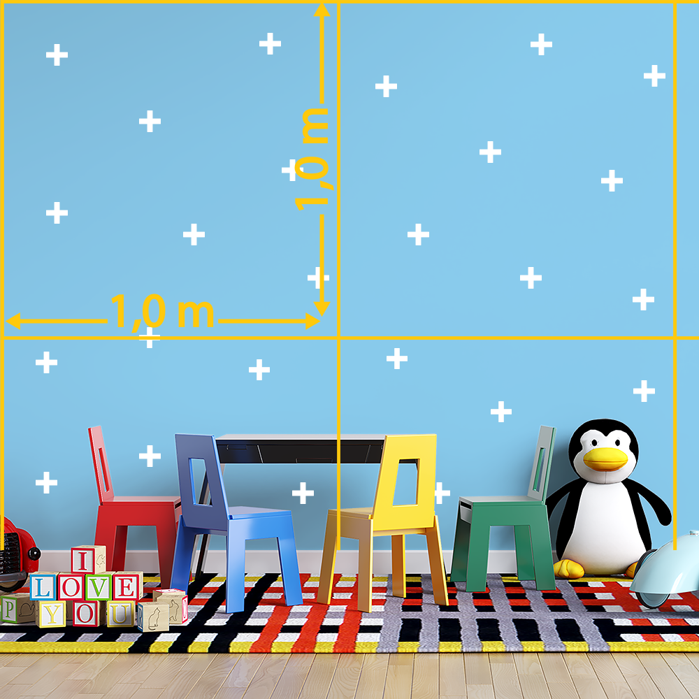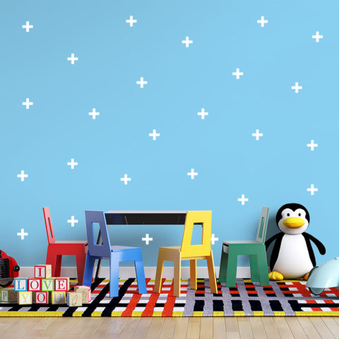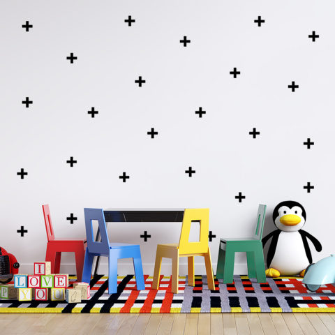 O adesivo de parede em formato Cruz está disponível em 7 opções de cores: branco, azul, rosa, combinação de rosa claro e escuro, preto, amarelo e multicores.