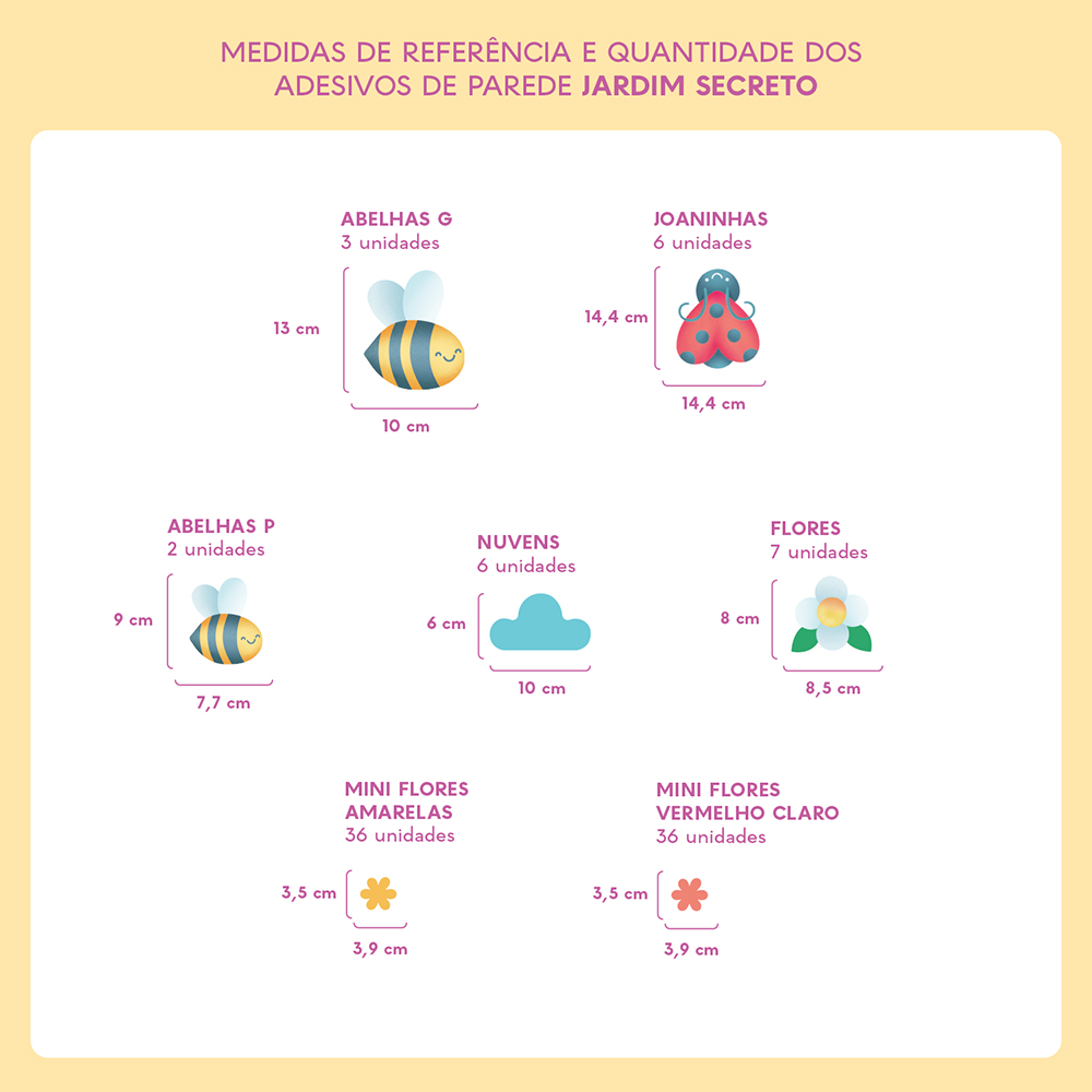 A sua parede vai ficar linda. Enviaremos junto com o seu adesivo de parede um guia completo com instruções detalhadas e sugestões de aplicação, para que você distribua os adesivos de forma harmoniosa e crie um espaço lúdico, perfeito para crianças.