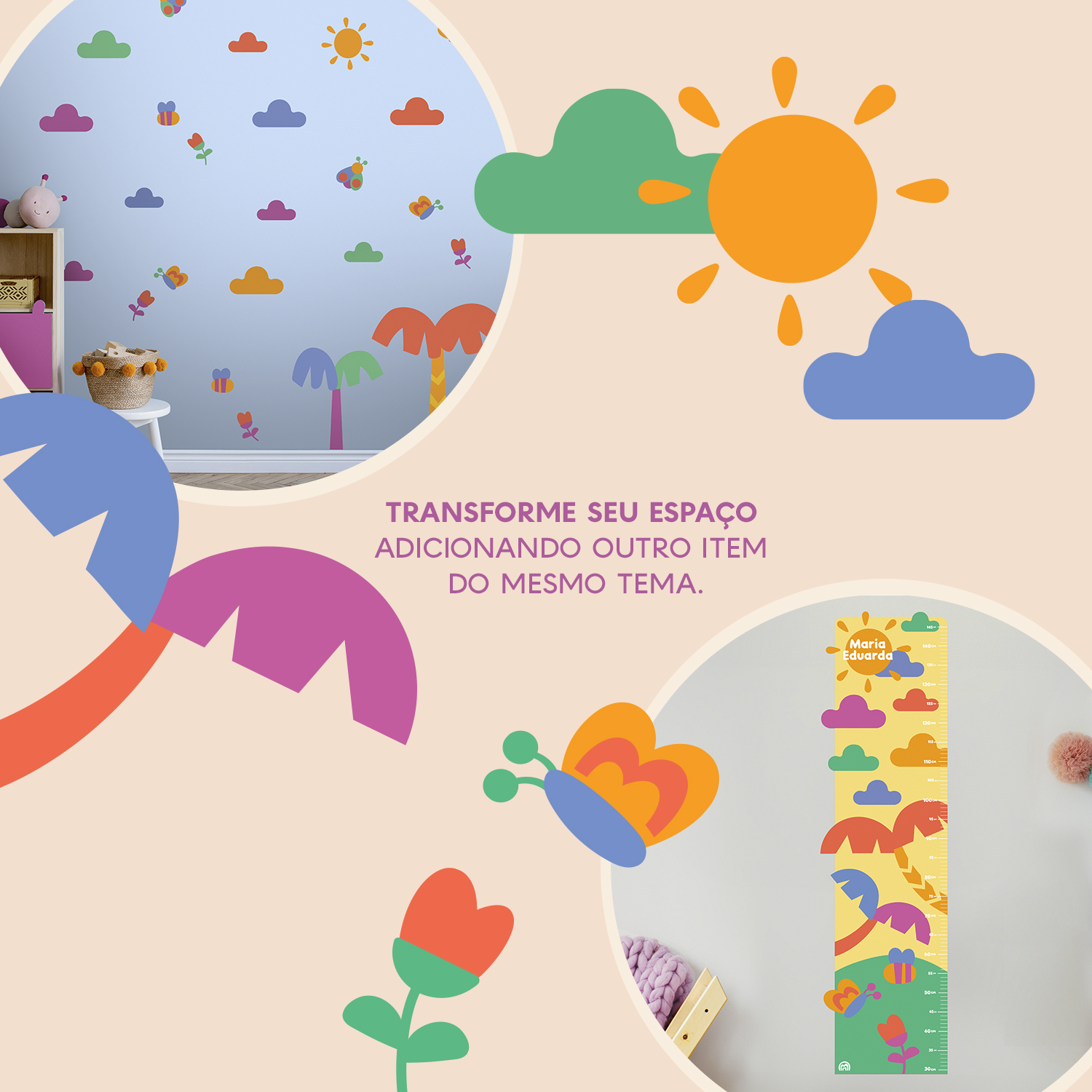Nossas réguas de crescimento adesivas personalizáveis acompanham o crescimento com muita alegria e transforma o quartinho em um mundo mágico.